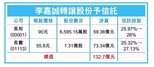 长实方面,李嘉诚则将个人持有约1.31亿股长实,以每股55.8元价格,注入信托基金,总值73.34亿元。